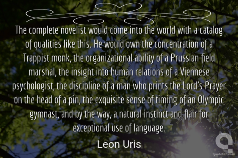 The complete novelist would come into the world with a catalog of qualities like this. He would own the concentration of a Trappist monk, the organizational ability of a Prussian field marshal, the insight into human relations of a Viennese psychologist, the discipline of a man who prints the Lord's Prayer on the head of a pin, the exquisite sense of timing of an Olympic gymnast, and by the way, a natural instinct and flair for exceptional use of language.