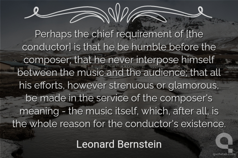 Perhaps the chief requirement of [the conductor] is that he be humble before the composer; that he never interpose himself between the music and the audience; that all his efforts, however strenuous or glamorous, be made in the service of the composer's meaning - the music itself, which, after all, is the whole reason for the conductor's existence.