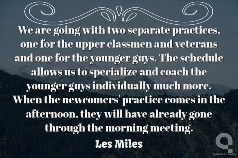 We are going with two separate practices, one for the upper classmen and veterans and one for the younger guys. The schedule allows us to specialize and coach the younger guys individually much more. When the newcomers' practice comes in the afternoon, they will have already gone through the morning meeting.