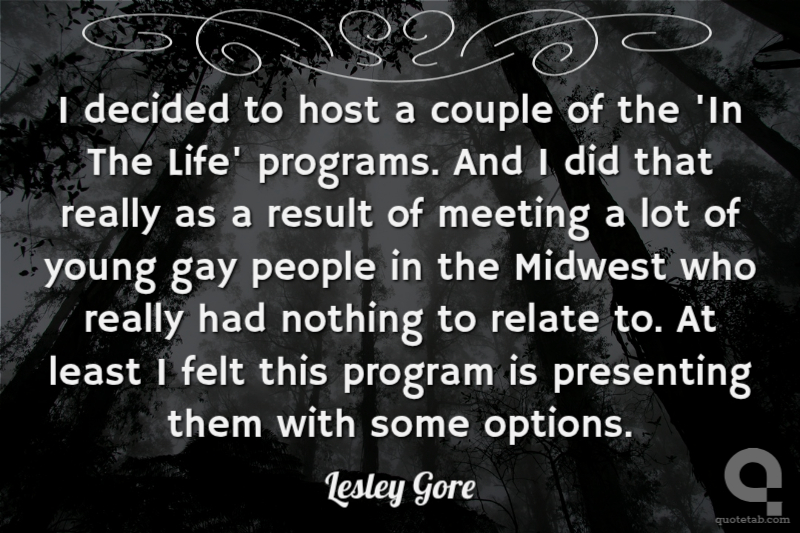 I decided to host a couple of the 'In The Life' programs. And I did that really as a result of meeting a lot of young gay people in the Midwest who really had nothing to relate to. At least I felt this program is presenting them with some options.