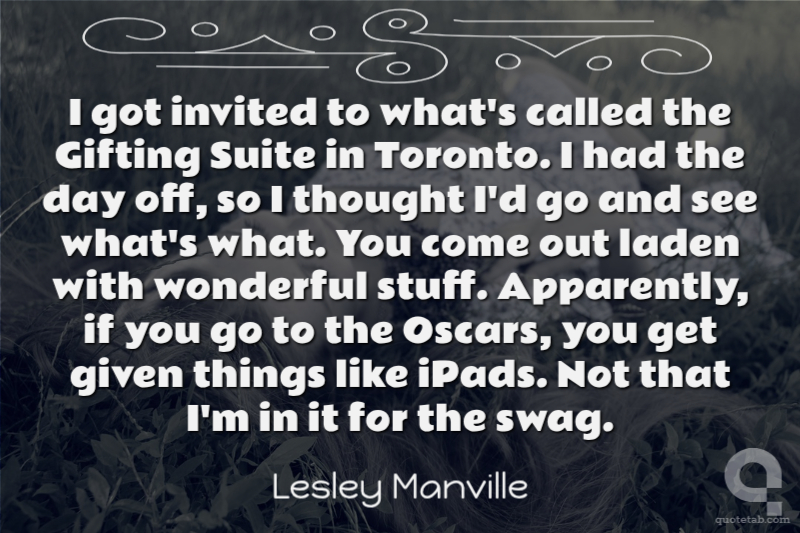 I got invited to what's called the Gifting Suite in Toronto. I had the day off, so I thought I'd go and see what's what. You come out laden with wonderful stuff. Apparently, if you go to the Oscars, you get given things like iPads. Not that I'm in it for the swag.