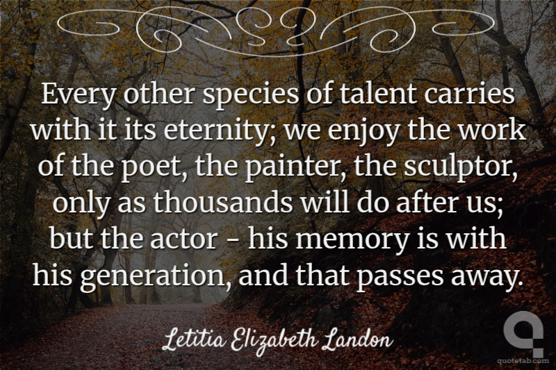 Every other species of talent carries with it its eternity; we enjoy the work of the poet, the painter, the sculptor, only as thousands will do after us; but the actor - his memory is with his generation, and that passes away.