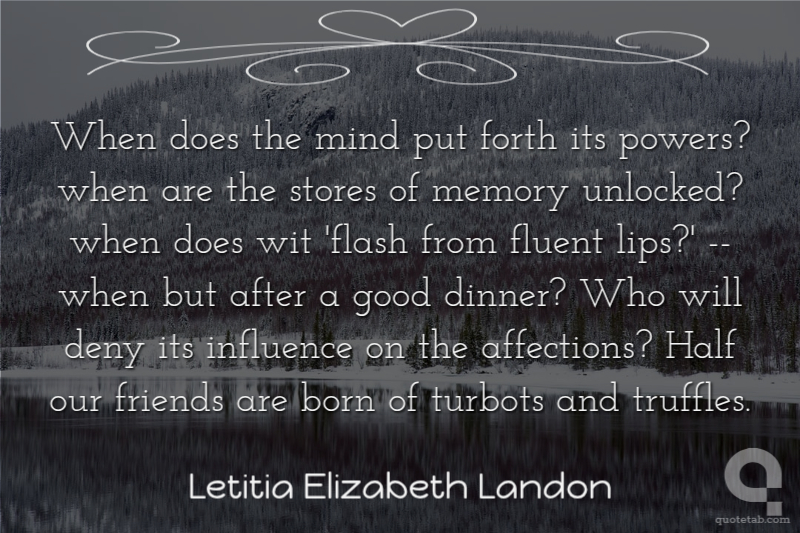 When does the mind put forth its powers? when are the stores of memory unlocked? when does wit 'flash from fluent lips?' -- when but after a good dinner? Who will deny its influence on the affections? Half our friends are born of turbots and truffles.
