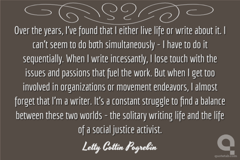 Over the years, I've found that I either live life or write about it. I can't seem to do both simultaneously - I have to do it sequentially. When I write incessantly, I lose touch with the issues and passions that fuel the work. But when I get too involved in organizations or movement endeavors, I almost forget that I'm a writer. It's a constant struggle to find a balance between these two worlds - the solitary writing life and the life of a social justice activist.