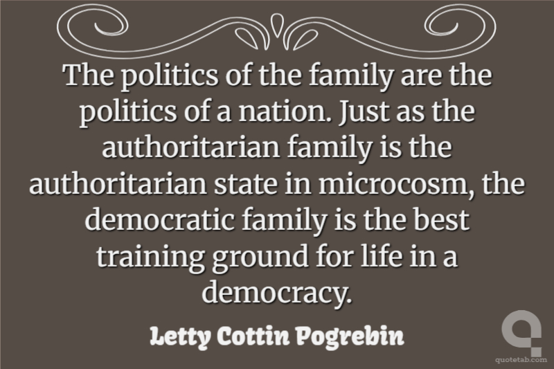 The politics of the family are the politics of a nation. Just as the authoritarian family is the authoritarian state in microcosm, the democratic family is the best training ground for life in a democracy.