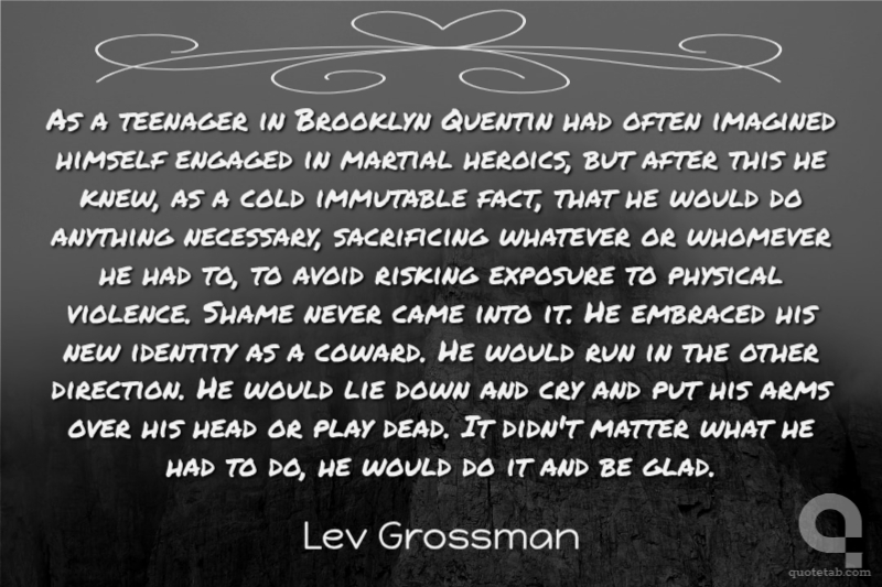 As a teenager in Brooklyn Quentin had often imagined himself engaged in martial heroics, but after this he knew, as a cold immutable fact, that he would do anything necessary, sacrificing whatever or whomever he had to, to avoid risking exposure to physical violence. Shame never came into it. He embraced his new identity as a coward. He would run in the other direction. He would lie down and cry and put his arms over his head or play dead. It didn't matter what he had to do, he would do it and be glad.