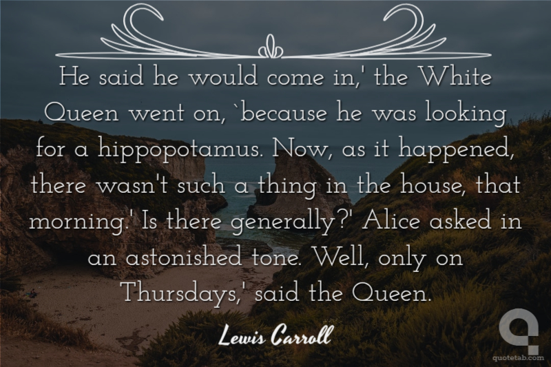 He said he would come in,' the White Queen went on, `because he was looking for a hippopotamus. Now, as it happened, there wasn't such a thing in the house, that morning.' Is there generally?' Alice asked in an astonished tone. Well, only on Thursdays,' said the Queen.