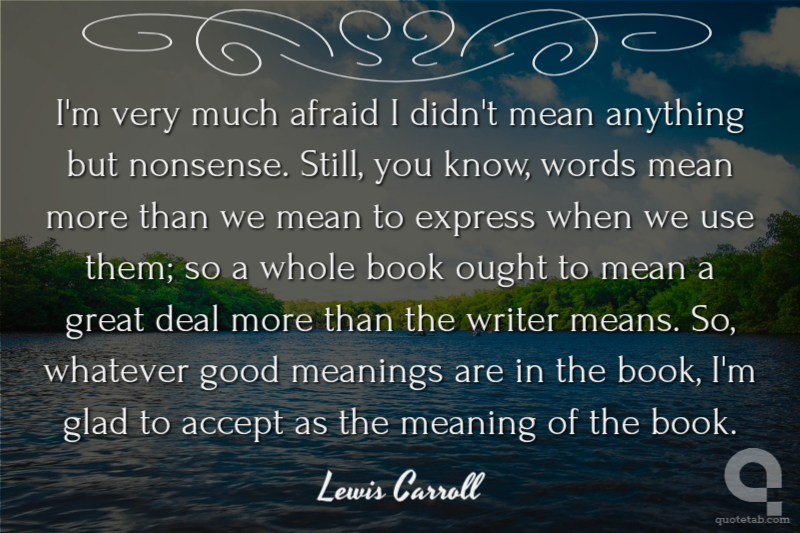 I'm very much afraid I didn't mean anything but nonsense. Still, you know, words mean more than we mean to express when we use them; so a whole book ought to mean a great deal more than the writer means. So, whatever good meanings are in the book, I'm glad to accept as the meaning of the book.