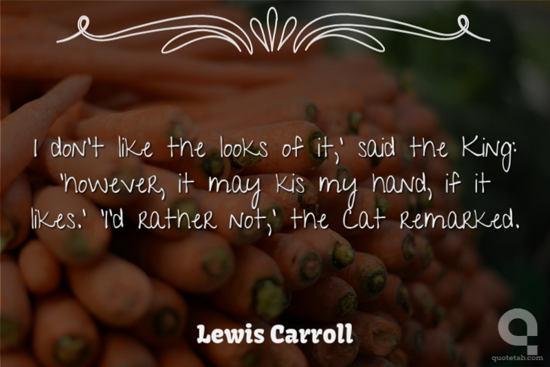 I don't like the looks of it,' said the King: 'however, it may kis my hand, if it likes.' 'I'd rather not,' the Cat remarked.