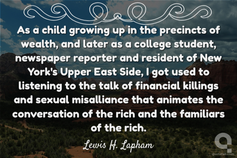 As a child growing up in the precincts of wealth, and later as a college student, newspaper reporter and resident of New York's Upper East Side, I got used to listening to the talk of financial killings and sexual misalliance that animates the conversation of the rich and the familiars of the rich.