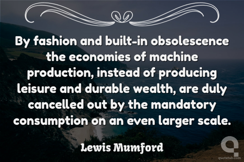 By fashion and built-in obsolescence the economies of machine production, instead of producing leisure and durable wealth, are duly cancelled out by the mandatory consumption on an even larger scale.