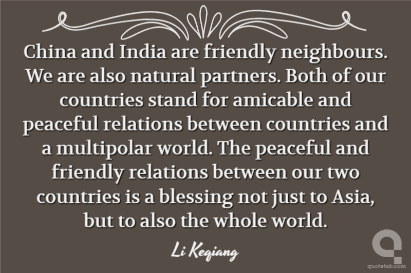 China and India are friendly neighbours. We are also natural partners. Both of our countries stand for amicable and peaceful relations between countries and a multipolar world. The peaceful and friendly relations between our two countries is a blessing not just to Asia, but to also the whole world.