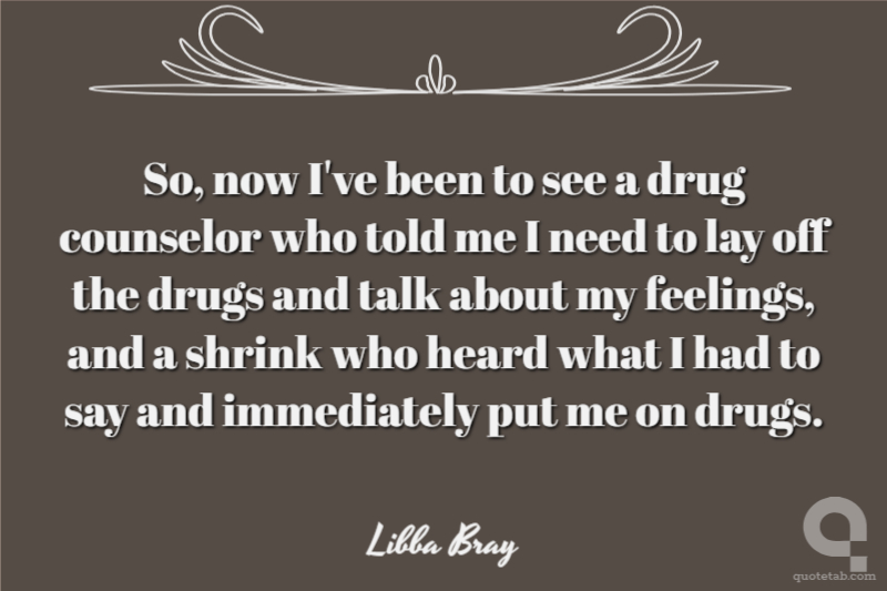 So, now I've been to see a drug counselor who told me I need to lay off the drugs and talk about my feelings, and a shrink who heard what I had to say and immediately put me on drugs.