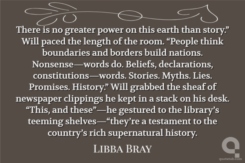 There is no greater power on this earth than story.” Will paced the length of the room. “People think boundaries and borders build nations. Nonsense—words do. Beliefs, declarations, constitutions—words. Stories. Myths. Lies. Promises. History.” Will grabbed the sheaf of newspaper clippings he kept in a stack on his desk. “This, and these”—he gestured to the library’s teeming shelves—“they’re a testament to the country’s rich supernatural history.