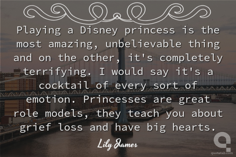 Playing a Disney princess is the most amazing, unbelievable thing and on the other, it's completely terrifying. I would say it's a cocktail of every sort of emotion. Princesses are great role models, they teach you about grief loss and have big hearts.