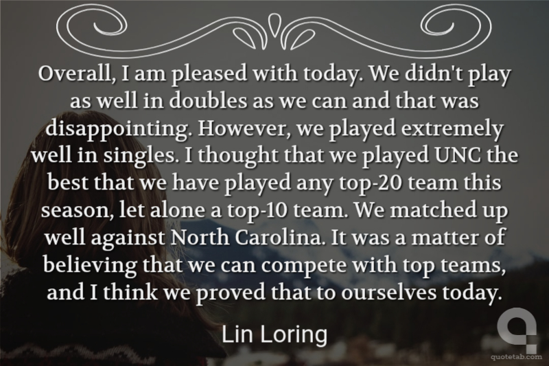 Overall, I am pleased with today. We didn't play as well in doubles as we can and that was disappointing. However, we played extremely well in singles. I thought that we played UNC the best that we have played any top-20 team this season, let alone a top-10 team. We matched up well against North Carolina. It was a matter of believing that we can compete with top teams, and I think we proved that to ourselves today.