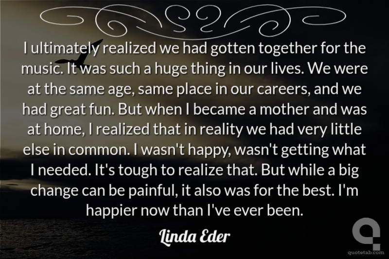 I ultimately realized we had gotten together for the music. It was such a huge thing in our lives. We were at the same age, same place in our careers, and we had great fun. But when I became a mother and was at home, I realized that in reality we had very little else in common. I wasn't happy, wasn't getting what I needed. It's tough to realize that. But while a big change can be painful, it also was for the best. I'm happier now than I've ever been.