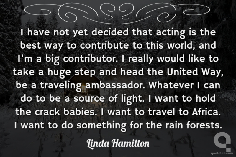 I have not yet decided that acting is the best way to contribute to this world, and I'm a big contributor. I really would like to take a huge step and head the United Way, be a traveling ambassador. Whatever I can do to be a source of light. I want to hold the crack babies. I want to travel to Africa. I want to do something for the rain forests.