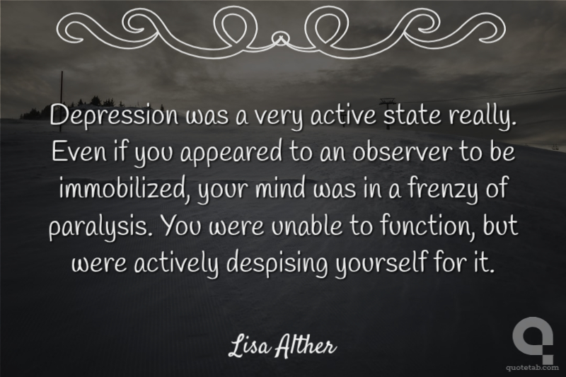 Depression was a very active state really. Even if you appeared to an observer to be immobilized, your mind was in a frenzy of paralysis. You were unable to function, but were actively despising yourself for it.