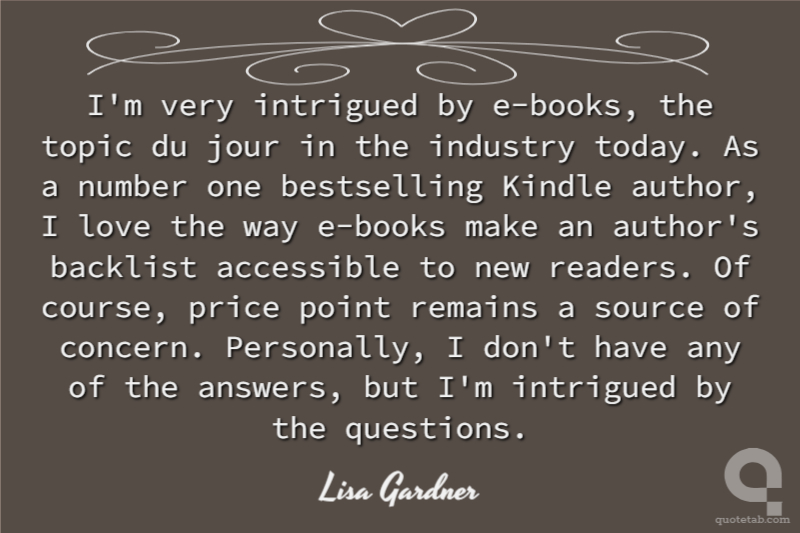 I'm very intrigued by e-books, the topic du jour in the industry today. As a number one bestselling Kindle author, I love the way e-books make an author's backlist accessible to new readers. Of course, price point remains a source of concern. Personally, I don't have any of the answers, but I'm intrigued by the questions.