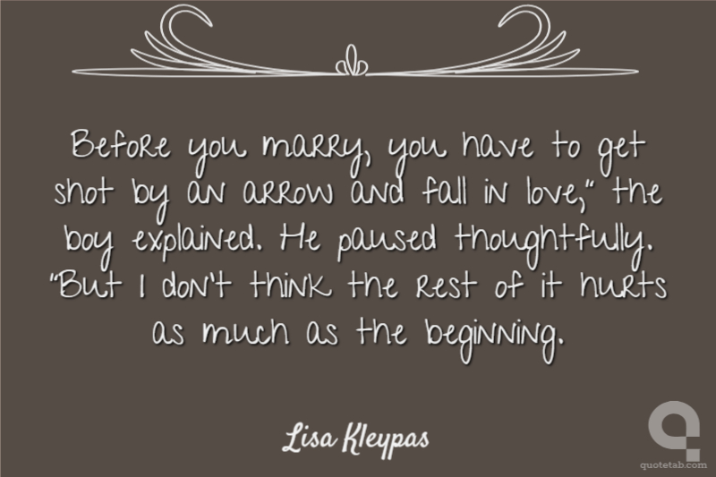 Before you marry, you have to get shot by an arrow and fall in love,” the boy explained. He paused thoughtfully. “But I don’t think the rest of it hurts as much as the beginning.