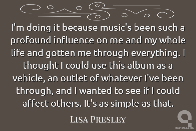 I'm doing it because music's been such a profound influence on me and my whole life and gotten me through everything. I thought I could use this album as a vehicle, an outlet of whatever I've been through, and I wanted to see if I could affect others. It's as simple as that.