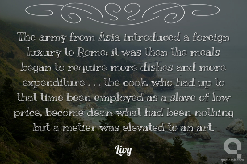 The army from Asia introduced a foreign luxury to Rome; it was then the meals began to require more dishes and more expenditure . . . the cook, who had up to that time been employed as a slave of low price, become dear: what had been nothing but a metier was elevated to an art.