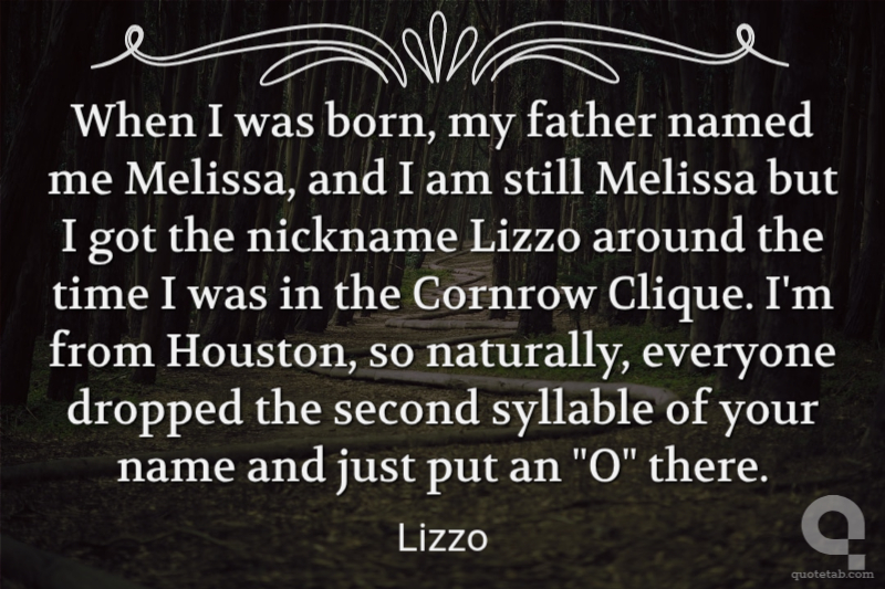 When I was born, my father named me Melissa, and I am still Melissa but I got the nickname Lizzo around the time I was in the Cornrow Clique. I'm from Houston, so naturally, everyone dropped the second syllable of your name and just put an "O" there.