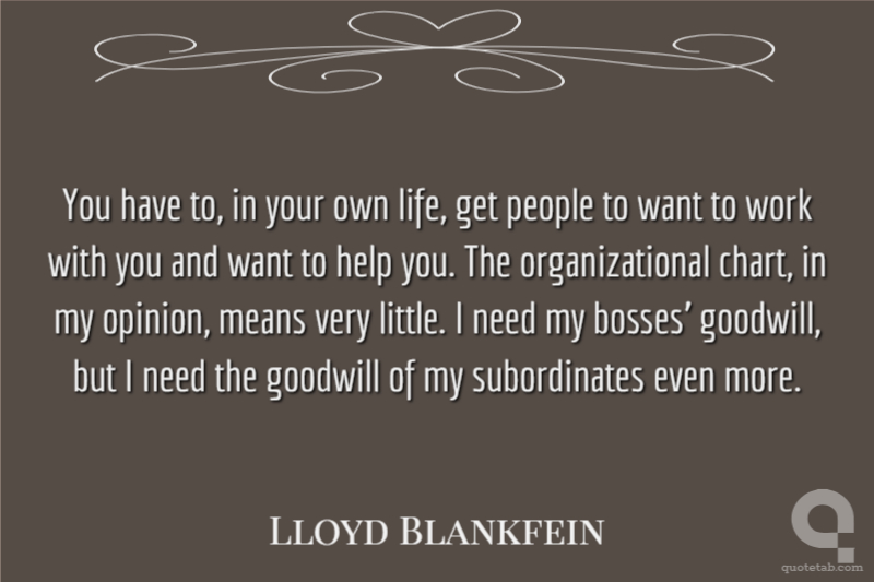 You have to, in your own life, get people to want to work with you and want to help you. The organizational chart, in my opinion, means very little. I need my bosses' goodwill, but I need the goodwill of my subordinates even more.