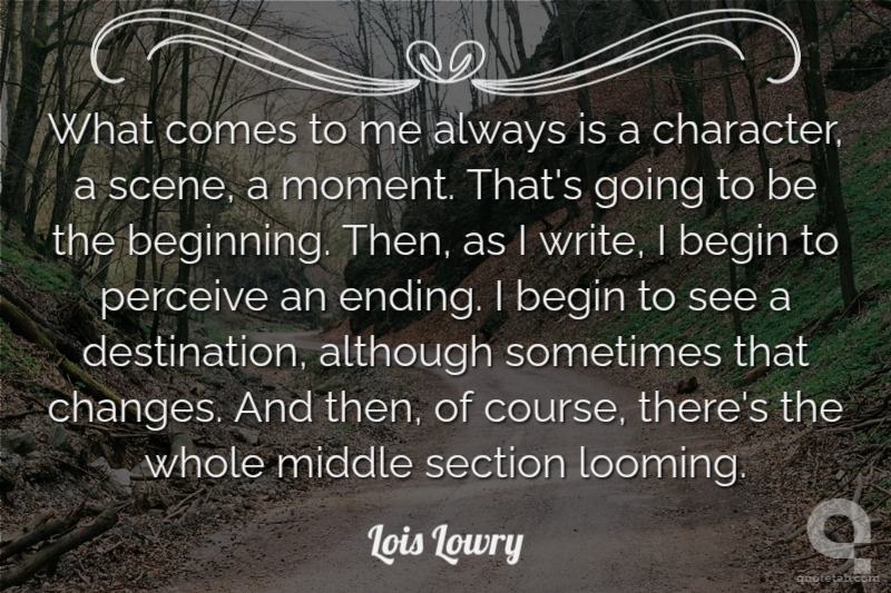 What comes to me always is a character, a scene, a moment. That's going to be the beginning. Then, as I write, I begin to perceive an ending. I begin to see a destination, although sometimes that changes. And then, of course, there's the whole middle section looming.