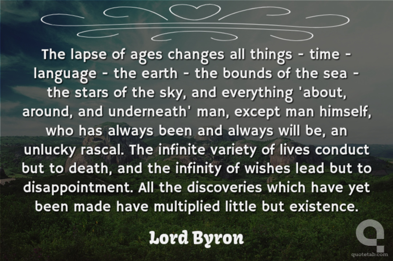 The lapse of ages changes all things - time - language - the earth - the bounds of the sea - the stars of the sky, and everything 'about, around, and underneath' man, except man himself, who has always been and always will be, an unlucky rascal. The infinite variety of lives conduct but to death, and the infinity of wishes lead but to disappointment. All the discoveries which have yet been made have multiplied little but existence.