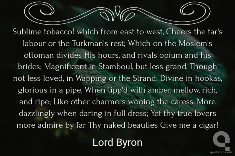 Sublime tobacco! which from east to west, Cheers the tar's labour or the Turkman's rest; Which on the Moslem's ottoman divides His hours, and rivals opium and his brides; Magnificent in Stamboul, but less grand, Though not less loved, in Wapping or the Strand: Divine in hookas, glorious in a pipe, When tipp'd with amber, mellow, rich, and ripe; Like other charmers wooing the caress, More dazzlingly when daring in full dress; Yet thy true lovers more admire by far Thy naked beauties Give me a cigar!