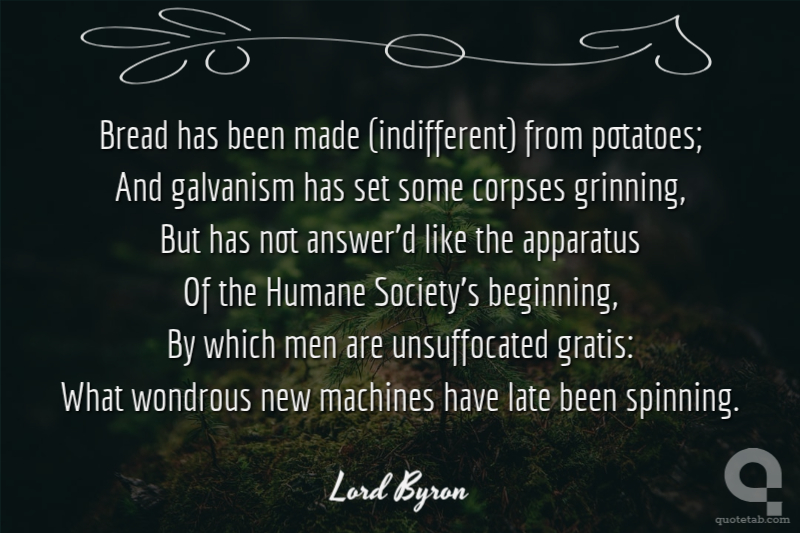 Bread has been made (indifferent) from potatoes; And galvanism has set some corpses grinning, But has not answer'd like the apparatus Of the Humane Society's beginning, By which men are unsuffocated gratis: What wondrous new machines have late been spinning.