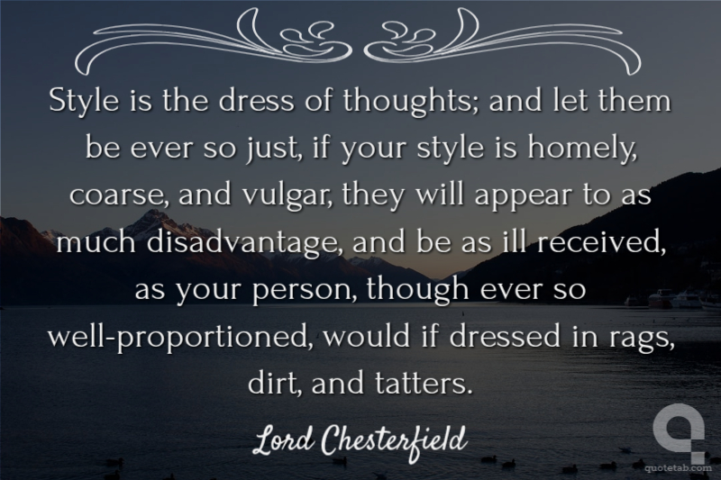 Style is the dress of thoughts; and let them be ever so just, if your style is homely, coarse, and vulgar, they will appear to as much disadvantage, and be as ill received, as your person, though ever so well-proportioned, would if dressed in rags, dirt, and tatters.