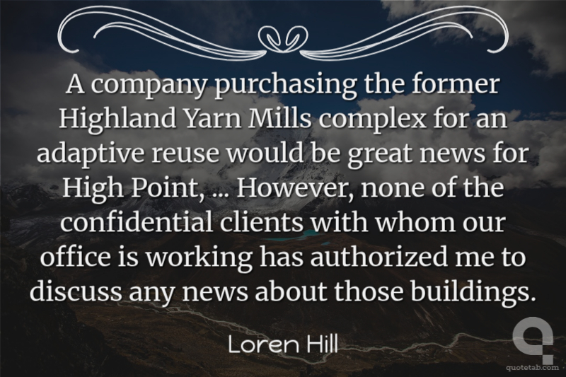 A company purchasing the former Highland Yarn Mills complex for an adaptive reuse would be great news for High Point, ... However, none of the confidential clients with whom our office is working has authorized me to discuss any news about those buildings.