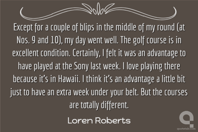 Except for a couple of blips in the middle of my round (at Nos. 9 and 10), my day went well. The golf course is in excellent condition. Certainly, I felt it was an advantage to have played at the Sony last week. I love playing there because it's in Hawaii. I think it's an advantage a little bit just to have an extra week under your belt. But the courses are totally different.