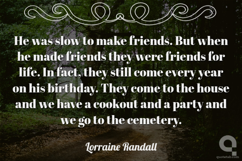 He was slow to make friends. But when he made friends they were friends for life. In fact, they still come every year on his birthday. They come to the house and we have a cookout and a party and we go to the cemetery.