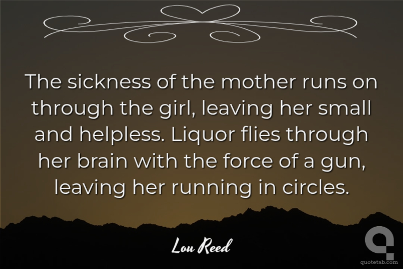 The sickness of the mother runs on through the girl, leaving her small and helpless. Liquor flies through her brain with the force of a gun, leaving her running in circles.