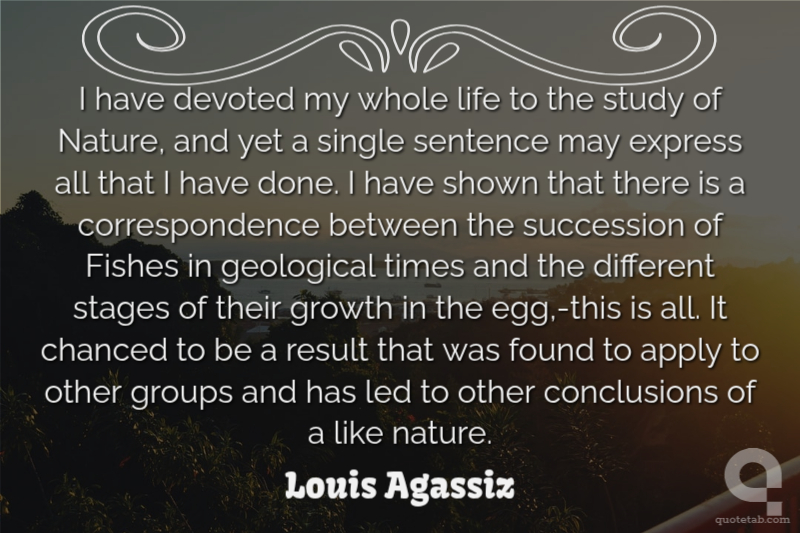 I have devoted my whole life to the study of Nature, and yet a single sentence may express all that I have done. I have shown that there is a correspondence between the succession of Fishes in geological times and the different stages of their growth in the egg,-this is all. It chanced to be a result that was found to apply to other groups and has led to other conclusions of a like nature.