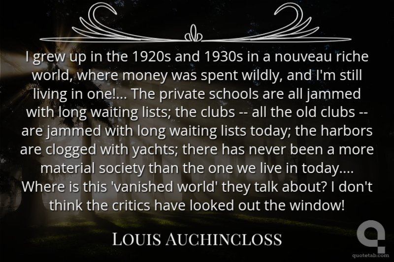 I grew up in the 1920s and 1930s in a nouveau riche world, where money was spent wildly, and I'm still living in one!... The private schools are all jammed with long waiting lists; the clubs -- all the old clubs -- are jammed with long waiting lists today; the harbors are clogged with yachts; there has never been a more material society than the one we live in today.... Where is this 'vanished world' they talk about? I don't think the critics have looked out the window!