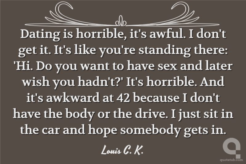 Dating is horrible, it's awful. I don't get it. It's like you're standing there: 'Hi. Do you want to have sex and later wish you hadn't?' It's horrible. And it's awkward at 42 because I don't have the body or the drive. I just sit in the car and hope somebody gets in.