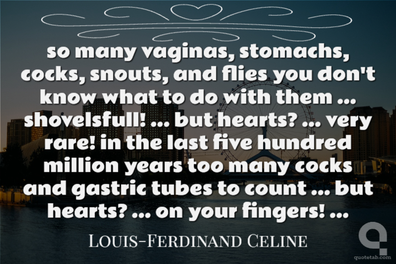 so many vaginas, stomachs, cocks, snouts, and flies you don't know what to do with them ... shovelsfull! ... but hearts? ... very rare! in the last five hundred million years too many cocks and gastric tubes to count ... but hearts? ... on your fingers! ...