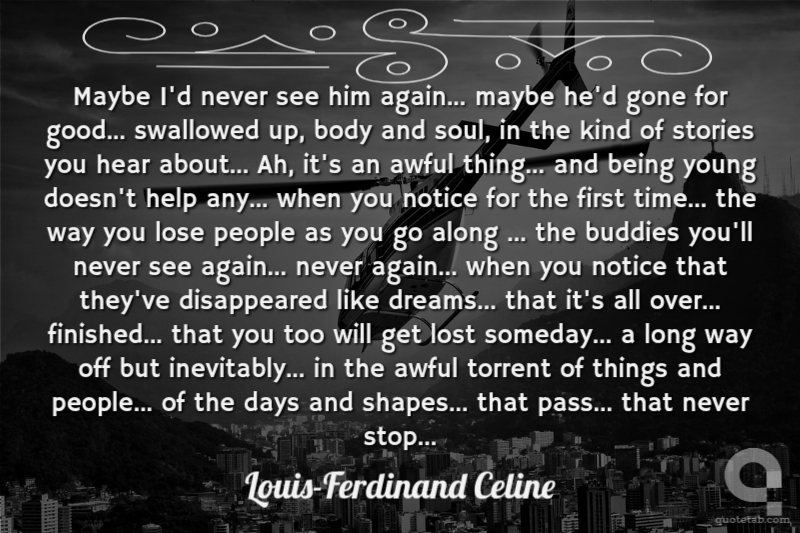 Maybe I'd never see him again... maybe he'd gone for good... swallowed up, body and soul, in the kind of stories you hear about... Ah, it's an awful thing... and being young doesn't help any... when you notice for the first time... the way you lose people as you go along ... the buddies you'll never see again... never again... when you notice that they've disappeared like dreams... that it's all over... finished... that you too will get lost someday... a long way off but inevitably... in the awful torrent of things and people... of the days and shapes... that pass... that never stop...