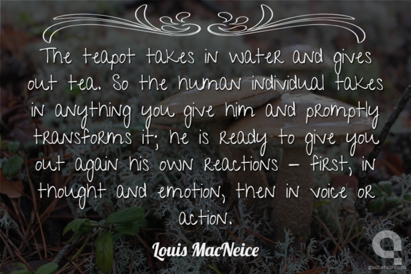 The teapot takes in water and gives out tea. So the human individual takes in anything you give him and promptly transforms it; he is ready to give you out again his own reactions - first, in thought and emotion, then in voice or action.