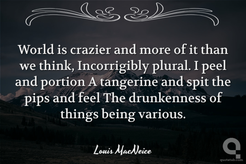 World is crazier and more of it than we think, Incorrigibly plural. I peel and portion A tangerine and spit the pips and feel The drunkenness of things being various.