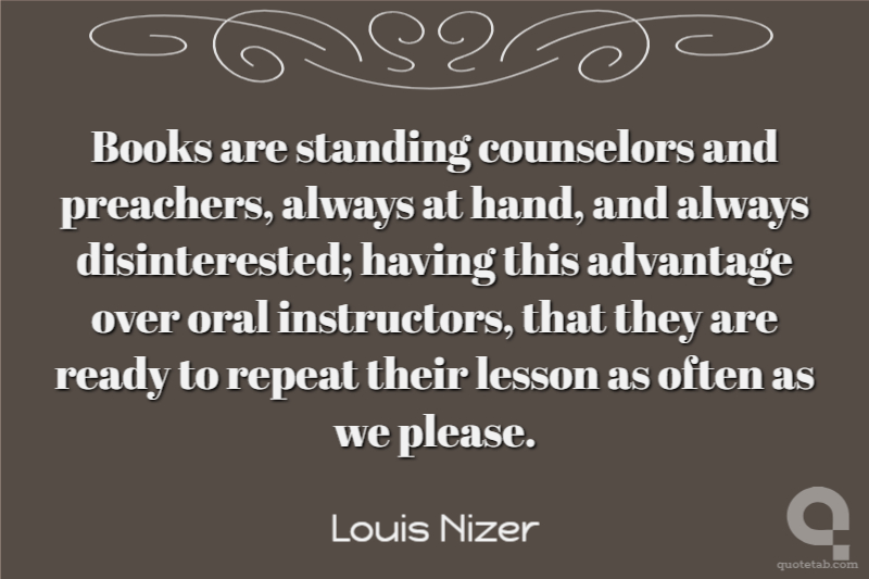 Books are standing counselors and preachers, always at hand, and always disinterested; having this advantage over oral instructors, that they are ready to repeat their lesson as often as we please.