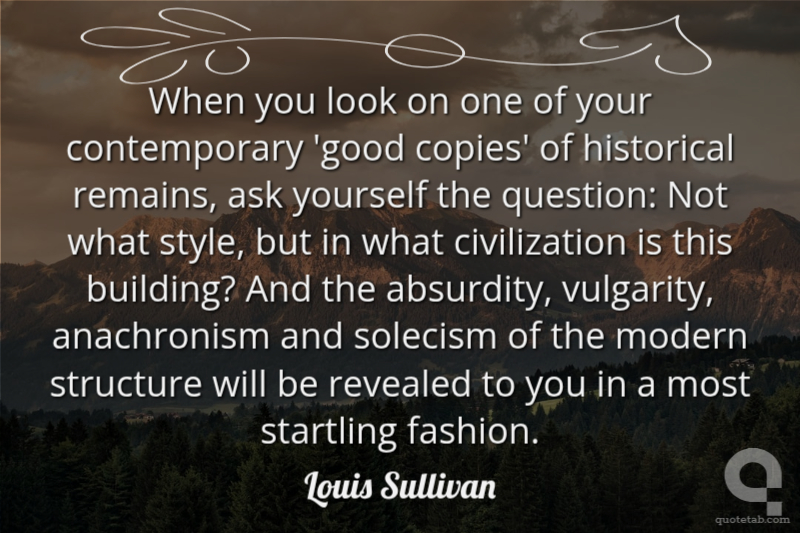 When you look on one of your contemporary 'good copies' of historical remains, ask yourself the question: Not what style, but in what civilization is this building? And the absurdity, vulgarity, anachronism and solecism of the modern structure will be revealed to you in a most startling fashion.