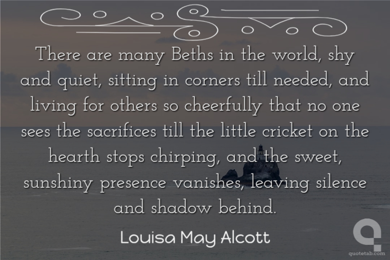 There are many Beths in the world, shy and quiet, sitting in corners till needed, and living for others so cheerfully that no one sees the sacrifices till the little cricket on the hearth stops chirping, and the sweet, sunshiny presence vanishes, leaving silence and shadow behind.