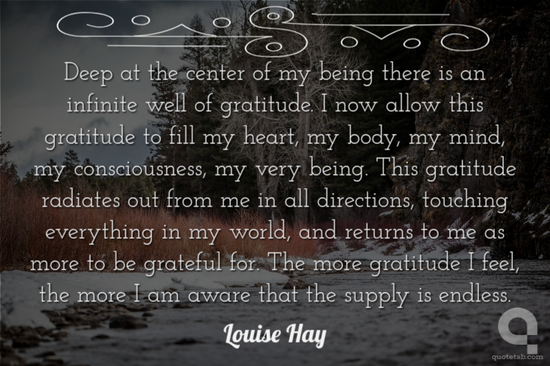 Deep at the center of my being there is an infinite well of gratitude. I now allow this gratitude to fill my heart, my body, my mind, my consciousness, my very being. This gratitude radiates out from me in all directions, touching everything in my world, and returns to me as more to be grateful for. The more gratitude I feel, the more I am aware that the supply is endless.