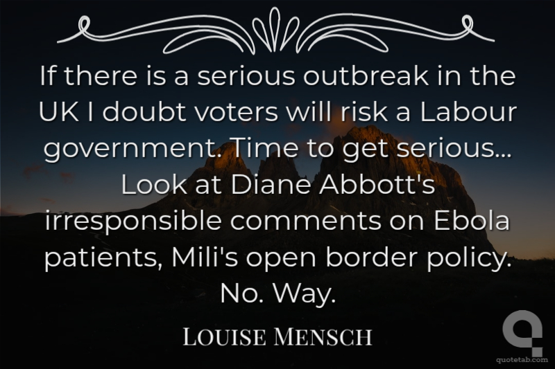 If there is a serious outbreak in the UK I doubt voters will risk a Labour government. Time to get serious... Look at Diane Abbott's irresponsible comments on Ebola patients, Mili's open border policy. No. Way.